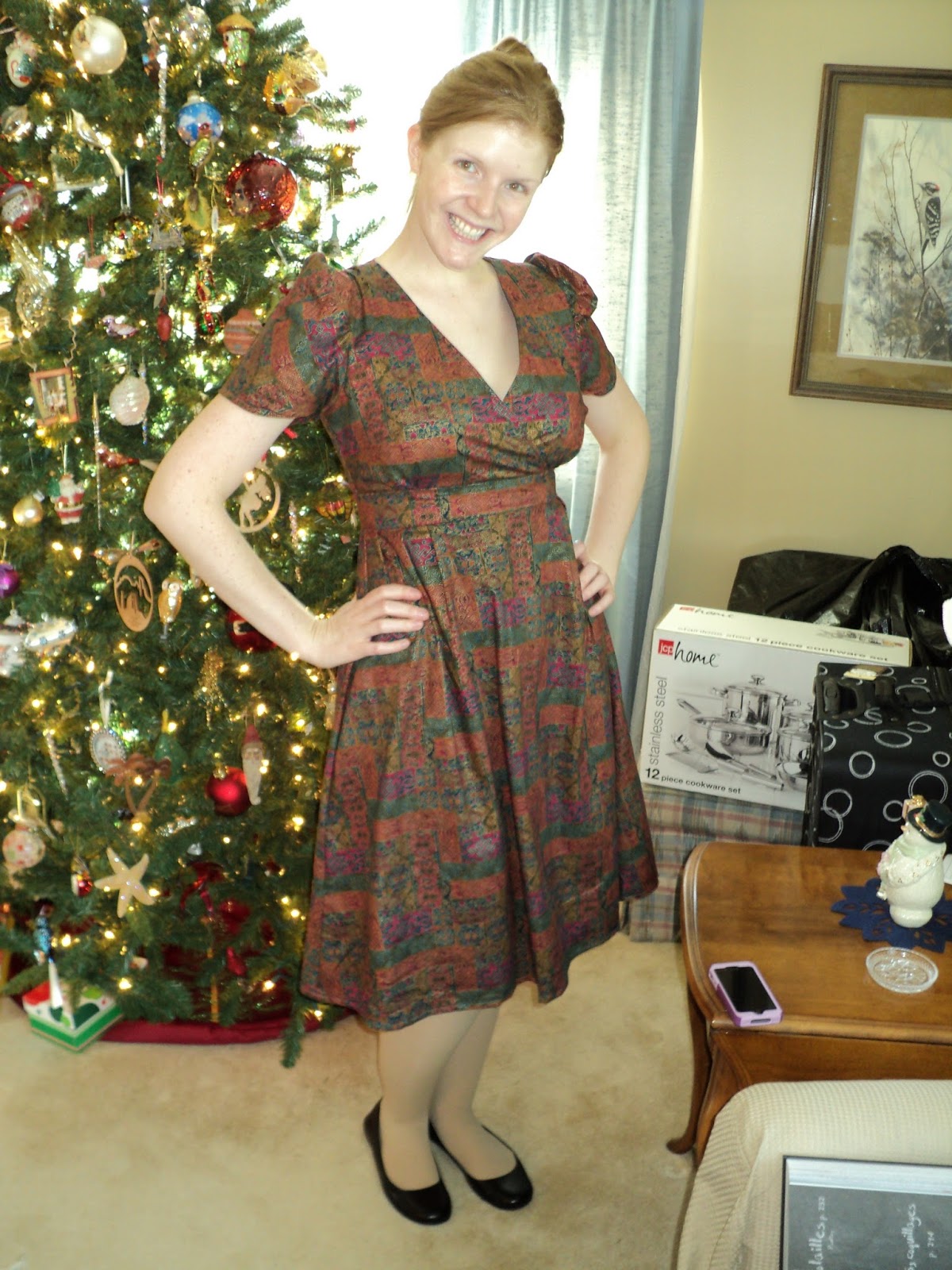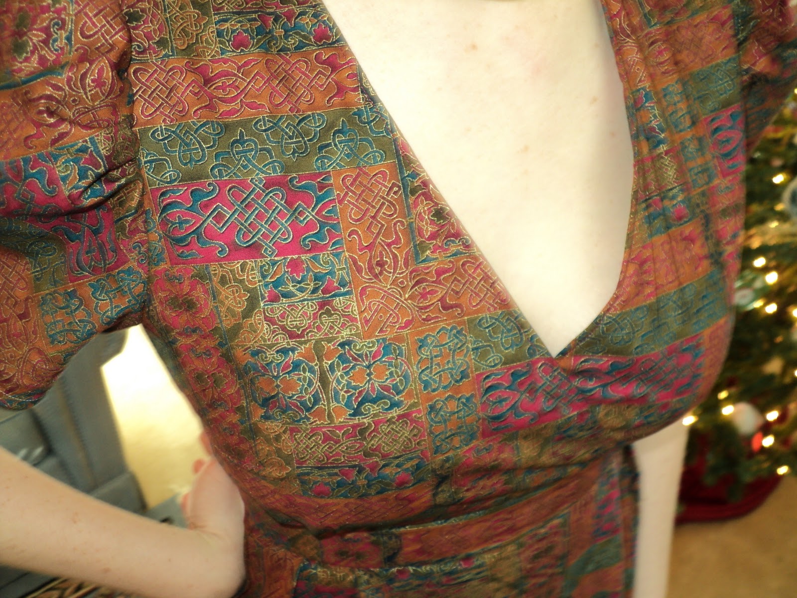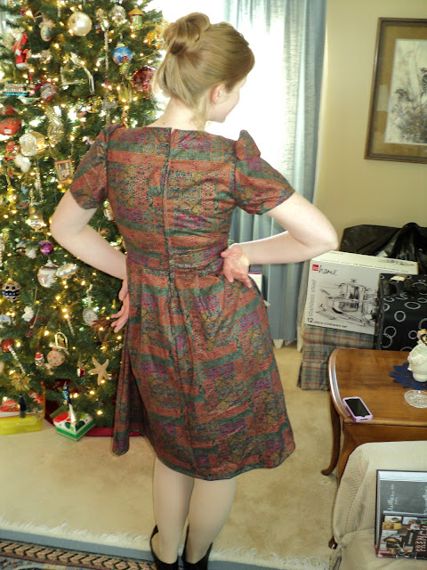 I wanted to make a dress for this festive occasion. Sometimes I feel like important (or highlight of the week) events are a good reason for making a new outfit. Oh, I'm going to a party? Must make myself a new top to wear. I do this all the time, and the holidays are no different. For this particular holiday, I made Simplicity 2549 in a FABULOUS fabric that has been lounging in my stash this whole year. I've been itching to use it and this challenge gave me the perfect opportunity.