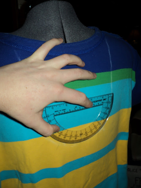 First, I moved the shirt around on Emma, making the original front the new back. I then traced my neckline (using a handy compass - much more useful for sewing than math, I say) down to the spot.